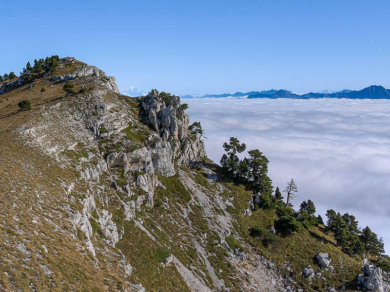 Le vent toujours fort, contrarie mon envie de flâner au sommet. Une mer de nuages inonde le Grésivaudan – seuls, les sommets émergent comme autant d'îles ensoleillées. En suivant la crête au plus près, je descends vers le Nord remarquant quelques cairns dont je ne comprends pas la signification : sorties de voie d'escalade, aires de saut pour amateur de base jump… ? Gardant le fil au point le plus bas, une petite sente se distingue bientôt du sentier qui va rejoindre le GR9 au-dessus du Cirque sans Nom. Elle s'oriente vers l'Est pour atteindre la pointe 1993m.