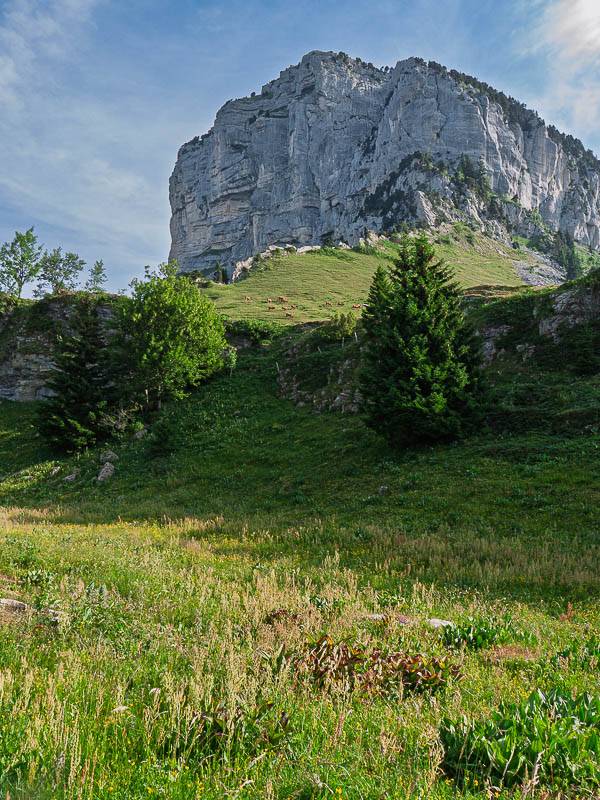 Dans le vallon sous le Col de l'Alpette, l'impressionnante Tête du Lion, le pilier Nord Ouest des falaises du Mont Granier (Chartreuse orientale, Entremont-le-Vieux, Savoie - 13/07/10)