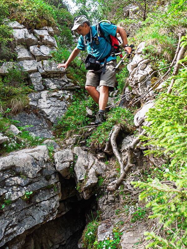 Descendu vers 1680m par le bon sentier, nous suivons maintenant à la descente celui de la doline. L'envie d'en découdre encore nous tenaille jusqu'au bout de la fatigue. À 1530 mètres, nous descendons le sentier déjà localisé vers le Sud Est. Remarquant de plus en plus les traces d'une exploitation forestière ancienne, incapables de dater l'âge des souches tronçonnées, nous traversons maintenant des replats atteint par le pied de falaises, par des talwegs à la végétation luxuriante, mais rien d'évident ne se dessine. Nous errons dans les pentes Nord sous le bord de la doline. De retour à la bifurcation, un bon sentier cette fois nous conduit jusqu'à une plateforme herbeuse encore encombrée des câbles d'acier d'un ancienne descente de débardage au bord de la falaise. La vue sur l'enfilade de la falaise Nord du Sommet du Pinet est magnifique. Carafe de vin brisée, goujons de fer rouillées, bout de câbles tressés témoignent d'une activité humaine intense dans ces raides pentes perdues qui dominent la Plagne…