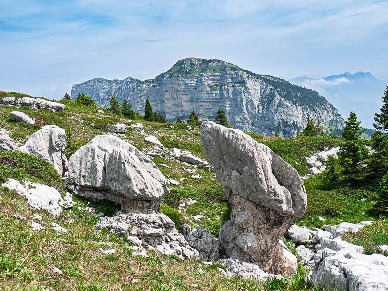 Devant le versant Ouest escarpé du Granier, un rocher taillé en flamme par l'érosion dans un creux du versant Est du Pinet au bord de falaises Nord (Chartreuse orientale, Entremont-le-Vieux, Savoie - 13/07/10)
