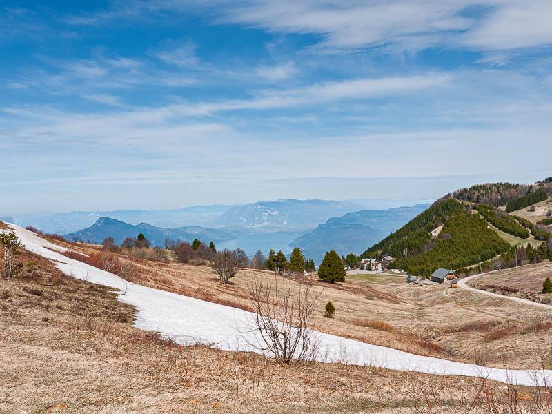 Sur la douce croupe de la Grande Montagne, je pose le sac à dos pour sortir le casse croûte. Assis parmi les crocus, la contemplation du paysage autour de Chambéry – une ville à la montagne – est un passe temps unique, incontournable. Pour trouver le sentier du Passage du Croc, la piste caillouteuse est une solution, mais le sentier qui part longer le bord des pentes de la crête est un meilleur choix.