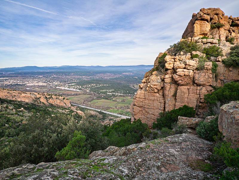 Passage de dalles dans l'ascension du Rocher de Roquebrune. La vue dégagée permet d'apprécier l’environnement caractéristique de ce secteur (Les Maures, Roquebrune-sur-Argens, Var – 23/12/12)