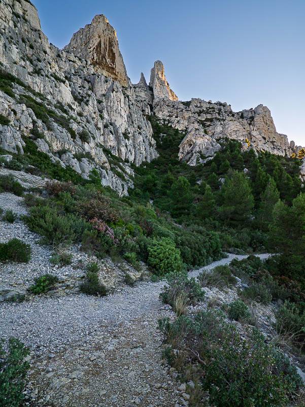Par les ruines du Jas, la piste déroule son ruban caillouteux dans un environnement superbe. Les premiers rayons de soleil colorent de rouge le calcaire des rochers du Crêt de Saint-Michel et de l’Aiguille de Sugiton. Et le paysage s’ouvre sur la baie de Morgiou et son cap éponyme au plateau caractéristique.