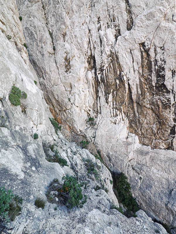 La rude ascension s’oriente à l’Est en rejoignant le Chemin du Centaure. Plus haut à droite un cairn marque le sentier de la Corniche du CAF. Les deux croix noires du balisage rassurent. Le passage plus étroit et très encaissé est maintenant rocailleux pour atteindre le pied du verrou.