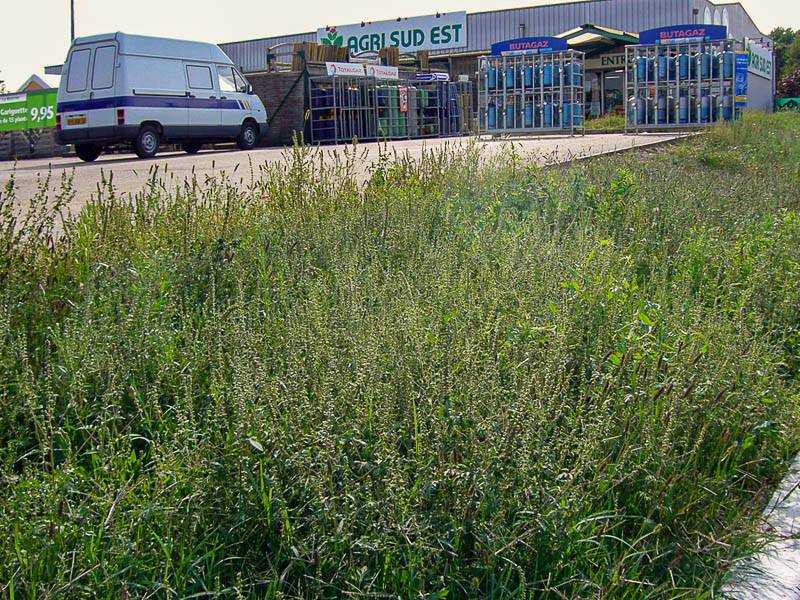 L'ambroisie, plante très allergène, est présente tout particulièrement dans la région Rhône-Alpes – même en bordure des parkings des supermarchés (Zone commerciale de Passins-Morestel, Isère - 13/09/2006).