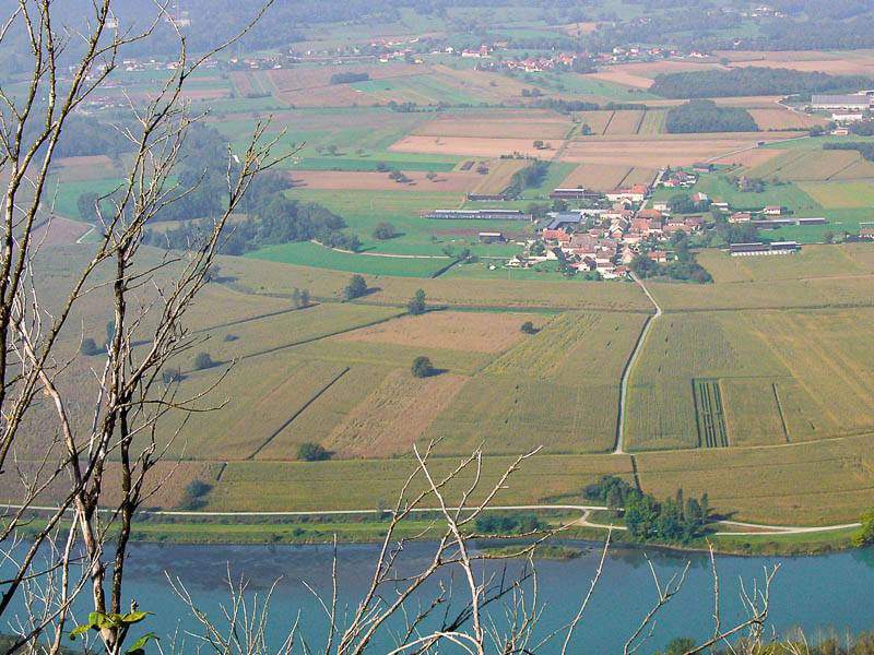 Le hameau de Bovinel dans la vallée du Rhône vu depuis le point de vue sur le GR9 (L'Infernal, Yenne, Avant Pays Savoyard - 30/09/2006)