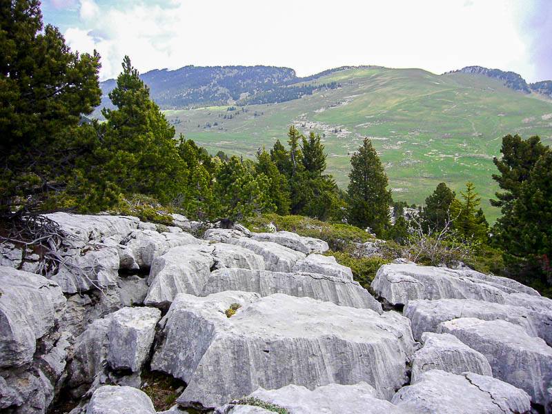 Le GR s'engage maintenant dans la traversée d'un superbe et imposant lapiaz que la pluie n'a pas rendu glissant. En repensant au projet de traversée à cheval de ce plateau – impossible – le chemin s'oriente bientôt à l'Ouest pour arriver à la sortie du Pas de l'Échelle. En s'engageant sur une bonne trace, je remarque un ancien balisage de marques bleues encore visibles qui aident à remonter la Roche de Fitta à travers lapiaz et bosquets serrés jusqu'à proximité du point coté 1737m où la trace et le balisage se perdent. Renonçant, je redescends quelques mètres jusqu'à la petite prairie que je viens de traverser et qui semble offrir une possibilité de progression vers le Nord sans trop s'éloigner de la crête. Bonne intuition, car je découvre une trace balisée de marques oranges qui marque un passage qui permet de progresser dans la bonne direction. Des cairns aident aussi à trouver le bon passage à travers ce dédale surprenant d'affleurements rocheux crevassés et de sapins qui rendent la progression peu évidente.