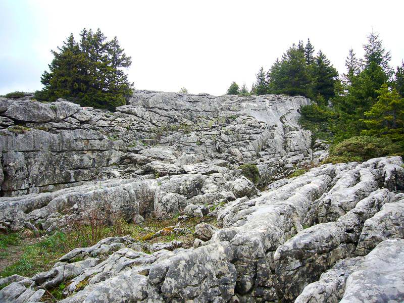 Imposant lapiaz qui impose un parcours d'équilibriste pour sauter de bloc en bloc avant de retrouver le terrain découvert des Rochers de Fouda Blanc (Chartreuse orientale, Saint-Pierre-d'Entremont, Savoie - 12/05/07)