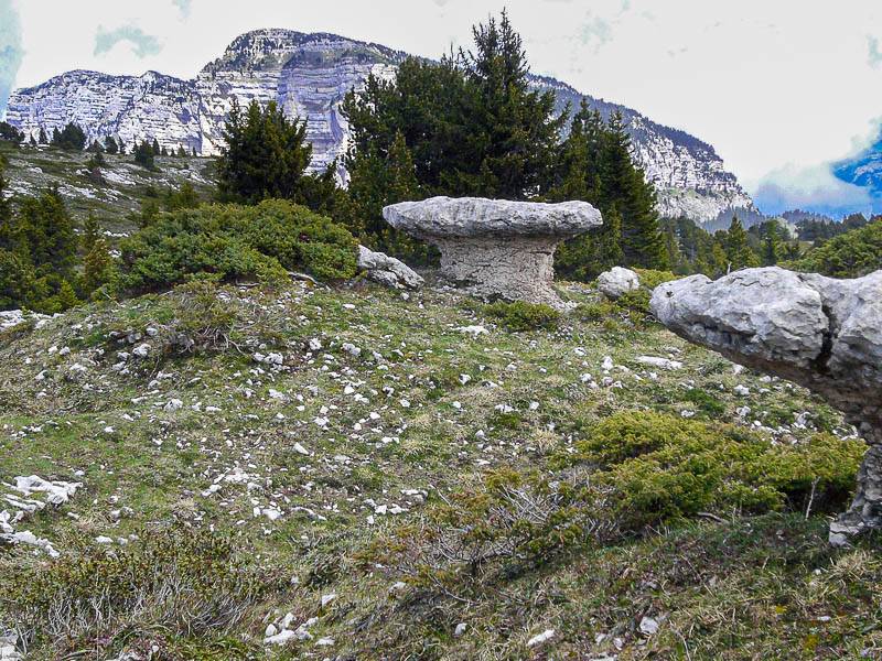 Le travail de l'érosion conduit à des formes parfois surprenantes comme en témoigne ce champignon de pierre qui se trouve au Sud du Sommet du Pinet (Chartreuse orientale, Entremont le Vieux, Savoie - 12/05/07)