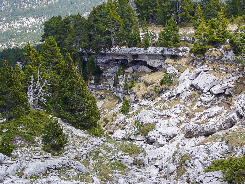 Bien qu'attentif pour ne pas rater le sentier qui vient du Pas de Fouda Blanc, un curieux passage dans la faille en Z d'un lapiaz géant sur une bonne dizaine de mètres me distrait et je me retrouve à environ 120 mètres en amont du passage ! Sur la crête, par une trace qui s'engage dans le versant Ouest, je reviens sur mes pas et longe un bel encorbellement pour trouver la sortie du pas au niveau du dernier ressaut – celui de la fissure décrite dans les différents topos – avant de sortir sur le plateau à nouveau dans une faille de lapiaz.