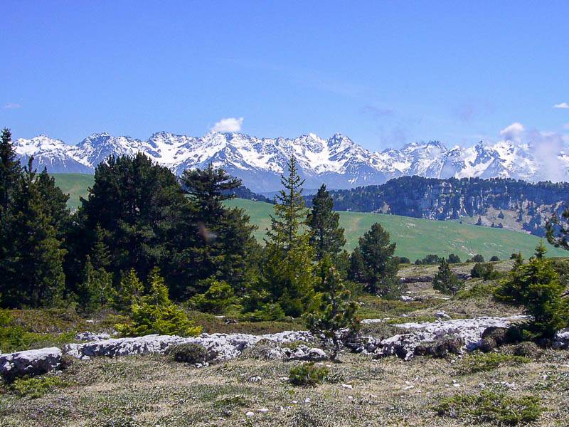 Récompense ou cerise sur le gâteau après le parcours du Grand Sangle du Fouda Blanc, un temps magnifique permet de voir le Mont Blanc en arrière plan du Granier et de la Porte de l'Alpette (Chartreuse orientale, Entremont-le-Vieux - 19/05/07)