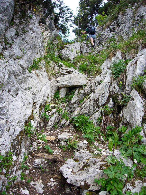 Au dessus d'une zone nommée la Combe des Arches comme une invitation à l'exploration, le parcours de la crête suit une trace évidente jalonnée de quelques marques blanches dont je n'avais jamais entendu parler. Sous les arbres et à travers de beaux lapiaz aux sculptures parfois extravagantes, la sente se rapproche souvent du bord de la falaise d'où le sangle est bien visible. D'abord ascendante jusque vers 1843m, le sommet du parcours, la trace parcourt maintenant des prairies vallonnées et fleuries qui présentent de beaux reliefs de bosses et de dépressions profondes clairsemées de rochers et pitons surprenants qui ont résisté à l'érosion.