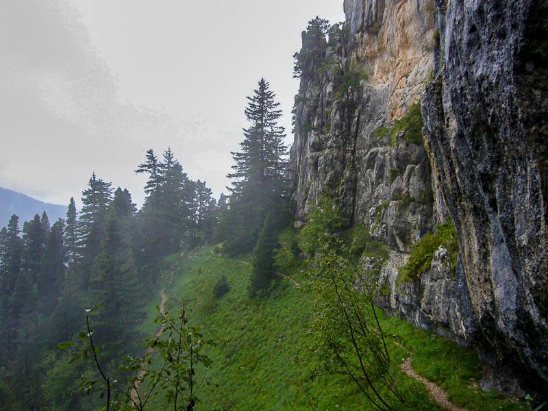 Arrivé au-dessus du couloir, les lacets du sentier apparaissent superposés et je suis étonné de trouver le passage aussi bon, bien entretenu. Même sous la pluie, la descente ne pose aucun problème, les barres rocheuses qui encadrent le couloir sont bien présentes, visibles dans les brumes qui se dissipent un peu. Et après une traversée au pied d'une superbe falaise, la bifurcation avec le sentier qui arrive du sangle boisé sous le Chaos de Bellefont est bien marquée [ UTM 31 0724298 5023692 ].