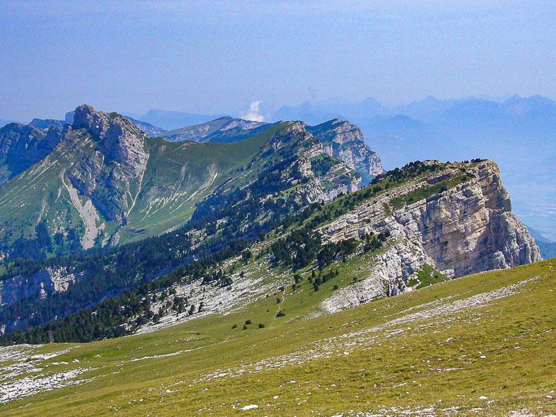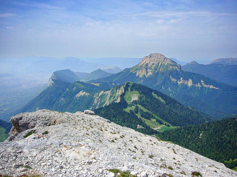 Sur le plateau ensoleillé, la marche devient plus facile. La croix sommitale devient perceptible entourée des silhouettes de quelques randonneurs. Encore quelques dizaines de mètres – j'y suis. Quelques pas au bord de l'à pic Est pour s'imprégner du vide, du paysage grandiose dans un voile épais annonciateur des orages qui ne manqueront pas d'éclater, mais cela sera pour plus tard dans la soirée. Assis sur une marche dans la sortie du pilier Sud face à la Chartreuse Sud dominée par Chamechaude, je sors le pique nique du sac à dos