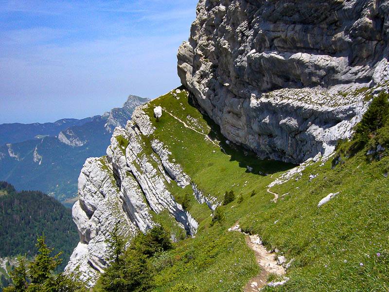 Du sommet, un regard sur la paroi vers le pas de l'Oeille découvre une large vire herbeuse dans laquelle court un sentier: c'est le sangle de la Barrère.
