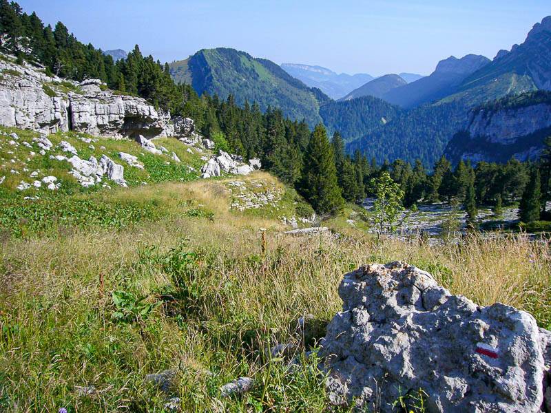 En descendant, on retrouvera la sente qui la paroi achevée, ramène sur le plateau que l'on remonte dans l'herbe haute presque sans trace jusqu'à retrouver le GR9 que l'on prendra à gauche pour traverser au Nord Est un superbe lapiaz plat et pente douce.
