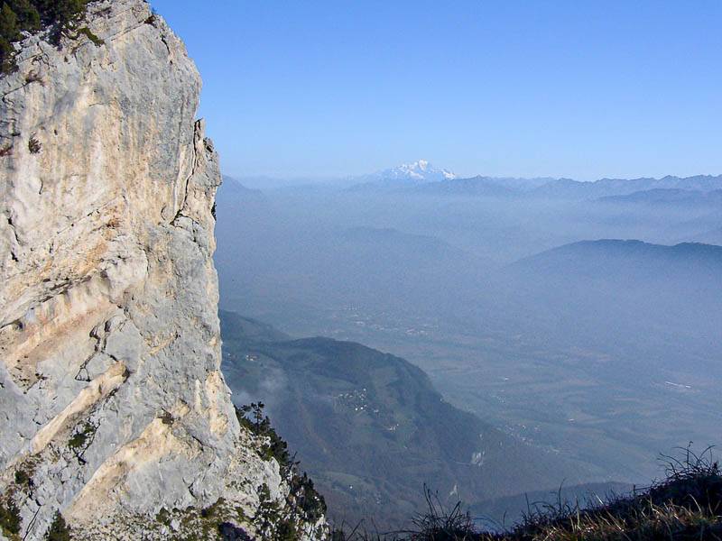 Ce pilier cache la célèbre paroi du Grand Manti – 400 m de verticalité au dessus du Grésivaudan avec le Mont Blanc en toile de fond (Chartreuse orientale, Sainte-Marie-du-Mont, Isère - 16/10/07)