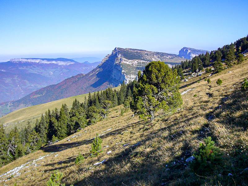 Près du bord droit de l'image, la trace est bien visible, avec en toile de fond : Roche Fitta, les Rochers du Fouda Blanc et le Granier à l'horizon et le Mont Outheran à gauche (Chartreuse orientale, Sainte-Marie-du-Mont, Isère - 16/10/07)