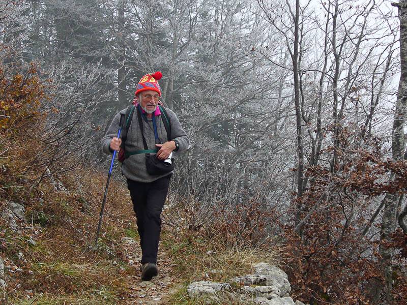 Les nombreuses pistes forestières ouvertes récemment pour faciliter le débardage ont bouleverser le paysage. Cependant, le sentier bien balisé des marques jaunes des PDIPR puis rouges et jaunes du Tour de Chartreuse se suit facilement. Et pour une fois, cela va sans dire, je ne suis pas le seul à me mêler de topo et d'orientation… Très bien tracé en nombreux lacets, la pente du vieux sentier est régulière pour ne fatiguer ni les hommes, ni les bêtes comme le disaient les muletiers d'antan. En prenant de l'altitude dans le brouillard, le sol gelé par endroit craque sous les pieds. Bientôt, la forêt change pour s'éclaircir, les pentes se garnissent de rochers, le bon chemin devient caillouteux pour nous déposer au Collet à 1520m dans un paysage semé d'arbres givrés.
