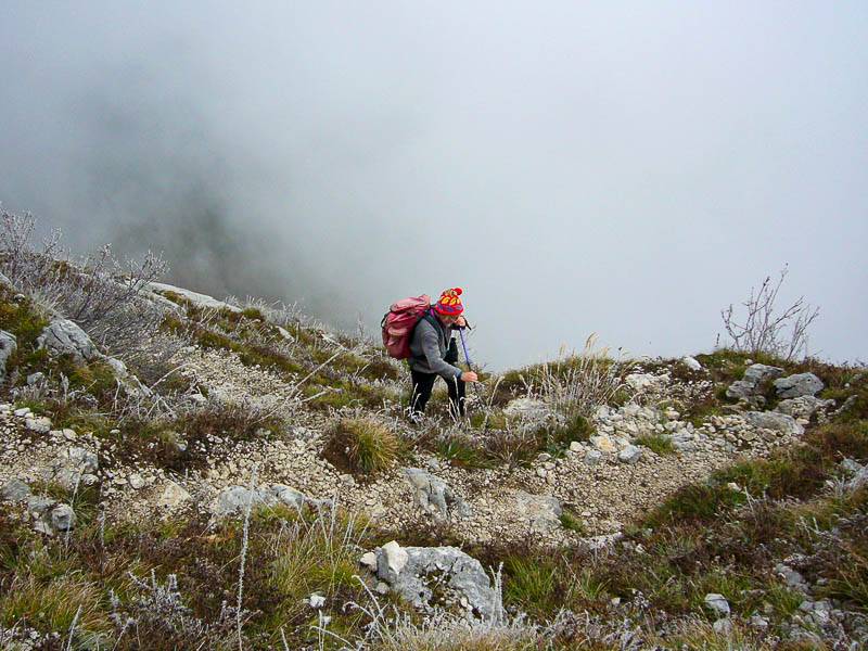 Le brouillard qui se dissipe reste accroché sur les sommets alors que le soleil qui réchauffe l'atmosphère autorise une pause. Mais le vent se lève à nouveau, s'engouffre dans la brèche, accélére, comme pour nous chasser. Le passage étroit au bord de la ravine de pierres moussues permet de sortir du vallon avant de dévaler dans la forêt par un sentier au tracé audacieux. Par endroit des marches sont taillées à travers les ressauts rocheux qu'il franchit dans une longue traversée vers le Nord. Alors qu'il perd de l'altitude à travers des pentes plus raides, il devient étroit. Recouvert de feuilles mortes fraîchement tombées. Plus difficile à suivre, attention de ne pas le perdre. Où il pourrait être utile, le balisage est précaire et je m'engage sur une mauvaise trace dans un raide talweg probablement sur la limite d'une parcelle forestière marquée de traits rouges sur les arbres [ UTM 31 0716622 5021588 ]. Le sentier poursuivant sa traversée était pourtant bien visible un peu plus loin…