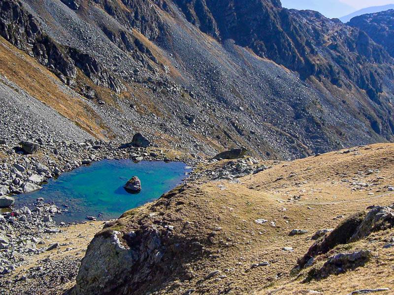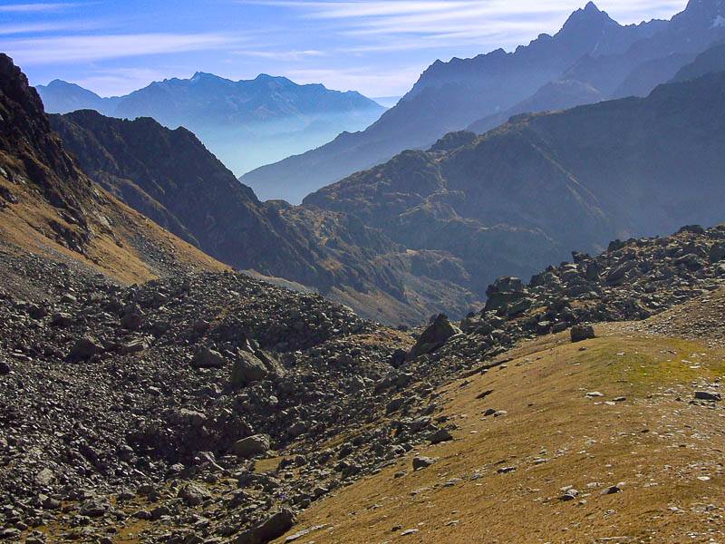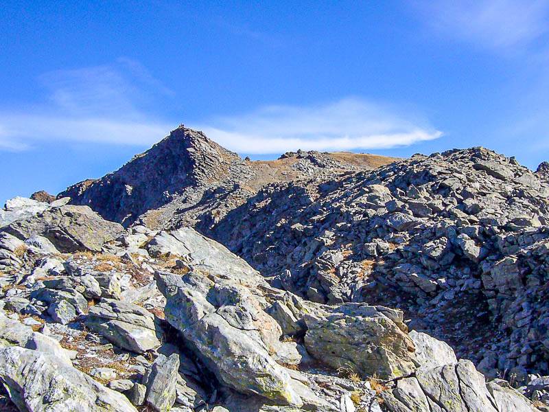 Quittant le fil de l'arête, je m'engage dans la descente du raide pierrier – désagréable. Recherchant les passages plus confortables, je rejoins le pied herbeux des rochers en rive gauche. Un vieux chemin qui semble y être tracé facilite grandement la descente, mais il faudra quand même traverser pour descendre quelques raides ravines avant de rattraper le confortable fond du vallon et retrouver enfin, le chemin de la montée. Un rocher large et plat m'accueille pour une pause méritée à l'écart du passage de la descente déjà fréquentée.