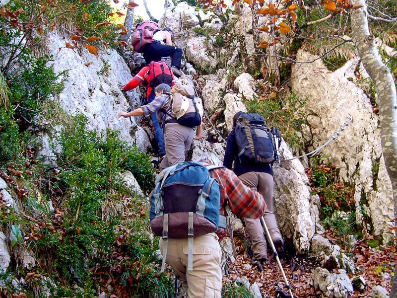 De nombreux passages sont sécurisés par des câbles posés en main courante (Chartreuse nord, Corbel, Savoie – 03/11/2007)