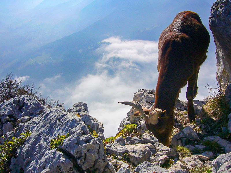 Rencontre insolite au sommet de la Roche Veyrand, deux charmantes chèvres viennent mendier quelques miettes des sandwichs sortis des sacs (Chartreuse nord, Corbel, Savoie – 03/11/2007)