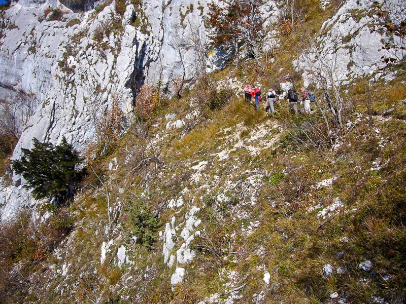 Parvenu dans un couloir herbeux très raide et exposé il grimpe en lacets. Plus haut il côtoie les encorbellements de la paroi d'en face, et débouche au-dessus dans la forêt.