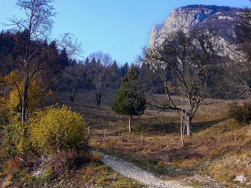 Sous la Roche en descendant de la Roche Veyrand, les prairies offrent une vue rare sur le Mont Granier et le Sommet du Pinet (Chartreuse nord, Corbel, Savoie – 03/11/2007)