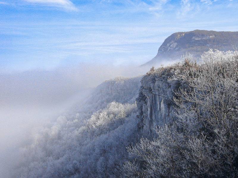 Dans l'atmosphère givrée de ce matin d'hiver, le Grand Thur succède aux falaises qui bordent à l'Ouest le plateau de Cherva, séparés par la dépression du Pas de la Roche. Au loin, le Grand Colombier (Bas Bugey, Izieu, Ain - 28/01/08)