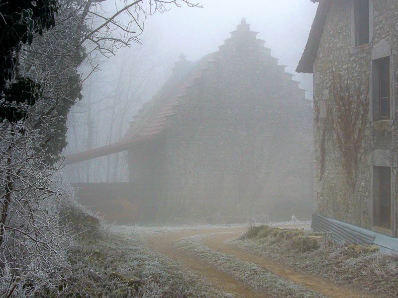 Arrivée dans le corps des bâtiments de la ferme de Lambra – le brouillard reste épais (Bas Bugey, Izieu, Ain - 28/01/08)