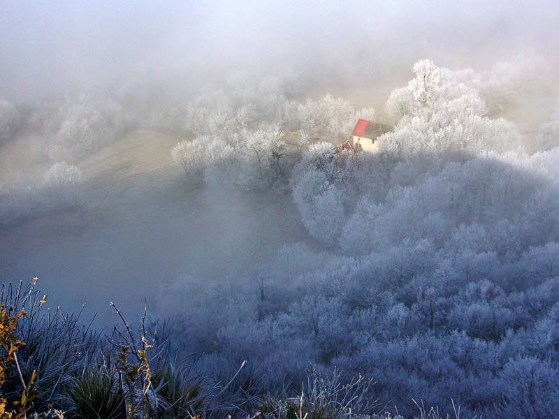Depuis le point de vue de la Contamine, les premiers rayons qui percent le brouillard givrant ensoleillent la ferme de Lambra (Bas Bugey, Izieu, Ain - 28/01/08)
