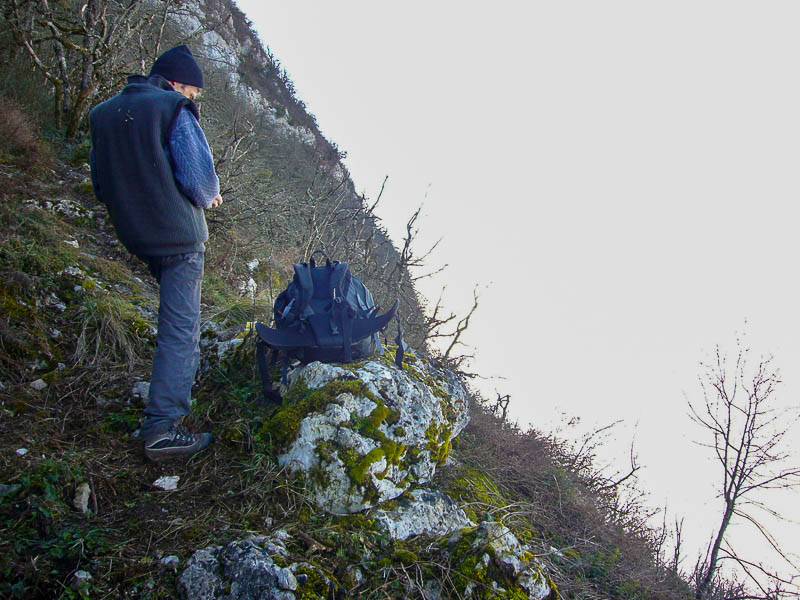 Dans la montée de la Graye, le sentier devenu rocheux offre un beau point de vue aérien (Bas Bugey, Saint-Benoît, Ain - 07/02/08)