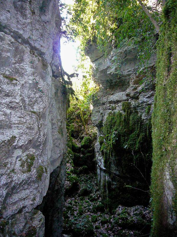 Des rochers moussus permettent de descendre au fond de la profonde faille (Bas Bugey, Serrières de Briord, Ain – 04/04/2008)