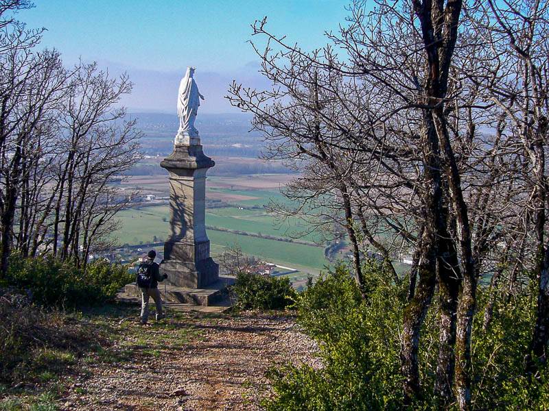 La Vierge de Chateland érigée au bord de la falaise domine Serrières de Briord. Un vaste point de vue sur la plaine du Rhône comble le regard (Bas Bugey, Serrières de Briord, Ain – 04/04/2008)
