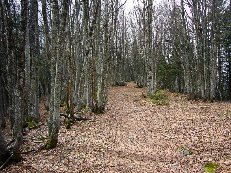 Nous sommes dans les nuages, le brouillard épais ne se lève pas et nous ne nous attardons pas pour suivre la crête vers le Nord. Cest au retour que le paysage s'offrira – en partie – à la contemplation. Le parcours de crête ou plutôt du bord du plateau boisé est aisé et très agréable. Au long des 1,8 kilomètres de ce trajet, les hêtraies traversées sont magnifiques.