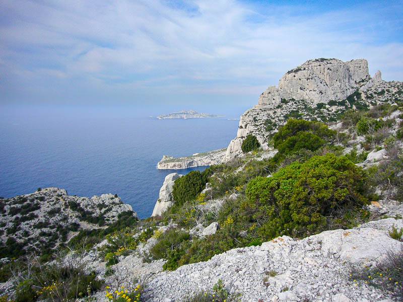 Dans la montée du Cap Gros, le versant Nord de la Grande Candelle se découpe sur fond de Méditerranée. En arrière plan, la presqu'ile et le cap Morgiou, plus loin sous l'horizon : l'Ile de Riou (Les Calanques, Marseille - 09/05/08)