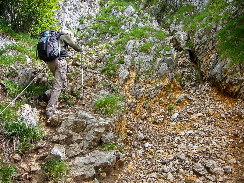 Du pied du couloir du versant Sud-Est de la Dent du Chat, jusqu'à la traversée qui conduit à l'arête, des câbles sécurisent et facilitent l'escalade. En avril 2007, ils avaient disparu. Volés !… Comme me l'avait expliqué l'agent de l'ONF responsable du secteur. Pas indispensables, on peut s'amuser à ne pas les utiliser sans grandes difficultés supplémentaires. Mais n'entrons pas dans la polémique de leur utilité.