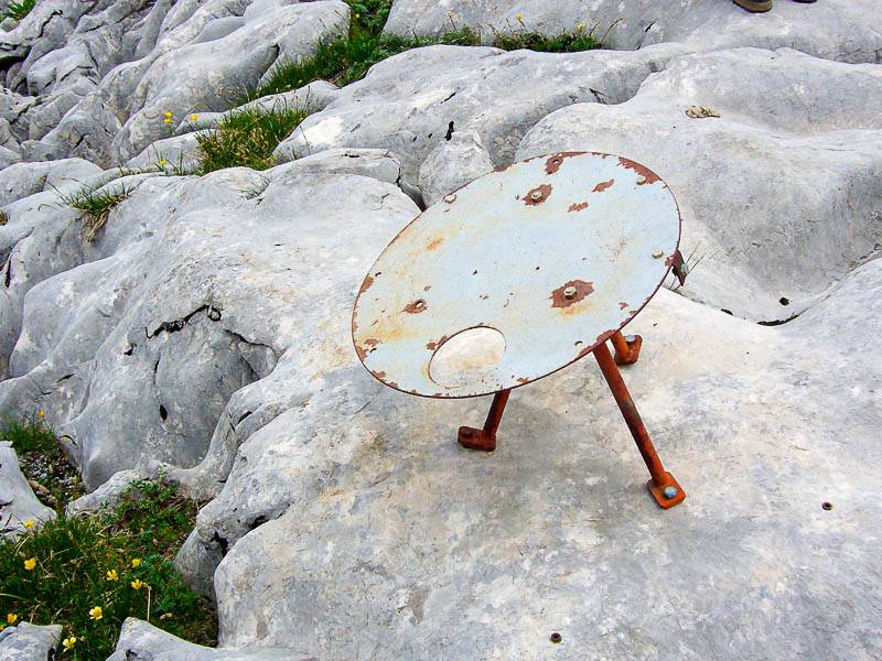 À une soixantaine de mètres du carrefour, ce drôle de support est complété par des cheville SPIT, et des plaquettes à vis pour fixer solidement plusieurs trépieds [ 31T 0724589 5023647 ]. De quoi exciter la curiosité et nourrir de vives discussions pour argumenter les théories, la chasse, l'observation, et l'astronomie. Cette dernière hypothèse semble plausible, l'installation pourrait permettre la solide fixation de lunettes astronomiques. Car la nuit dans ce coin, la pollution lumineuse des villes et de la civilisation pourrait être extrêmement réduite. Merci aux personnes qui sauront confirmer notre analyse.