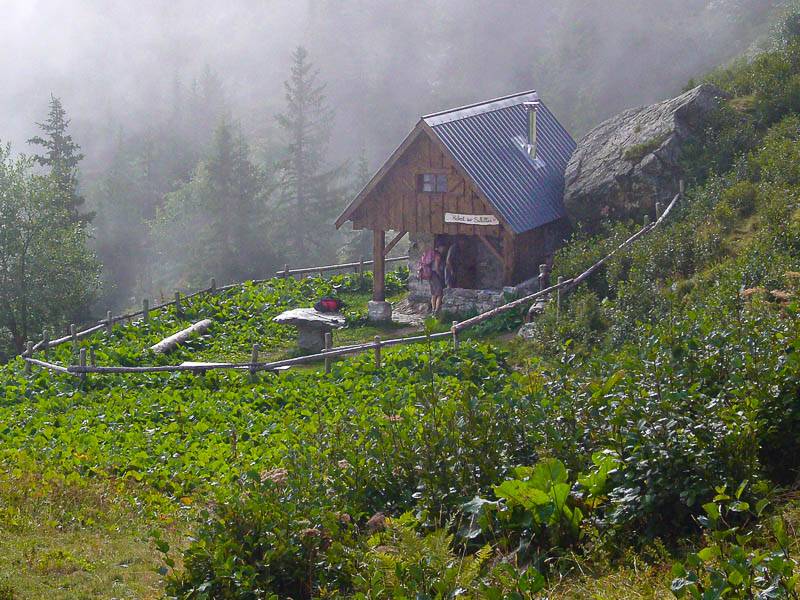 Alors que le brouillard se dissipe, apparaît la cabane bien aménagée du Habert des Sabottes (Belledonne Sud, , Isère - 26/08/08)