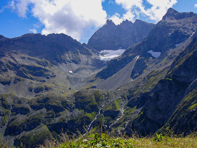 Au delà de la Vallée de la Vorz, entre le Grand Replomb et le Sommet Colomb, le Col de la Mine de Fer. On devine le refuge Jean Collet et le Habert de la Pierre (Belledonne Sud, Saint-Mury-Monteymond, Isère - 26/08/08)