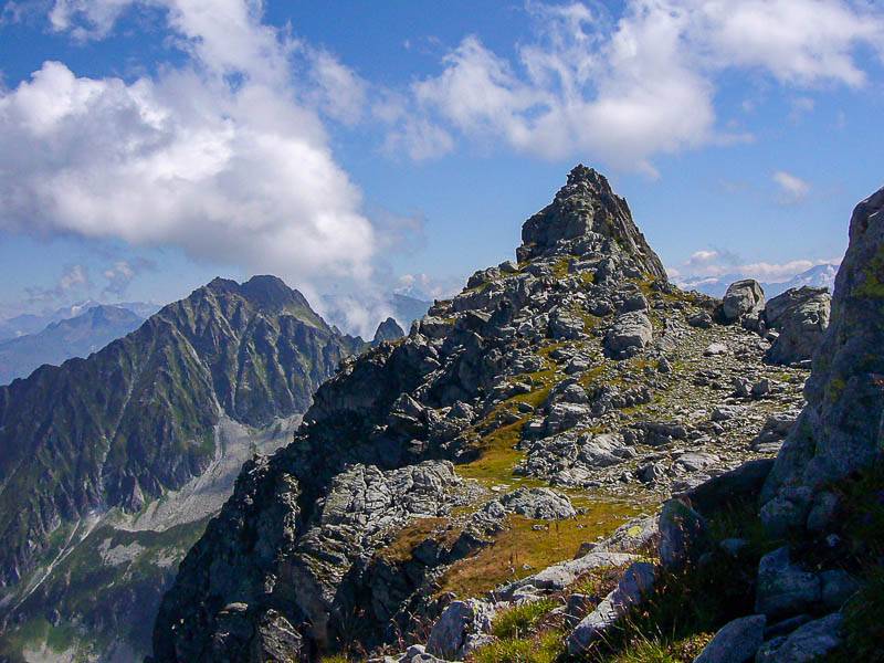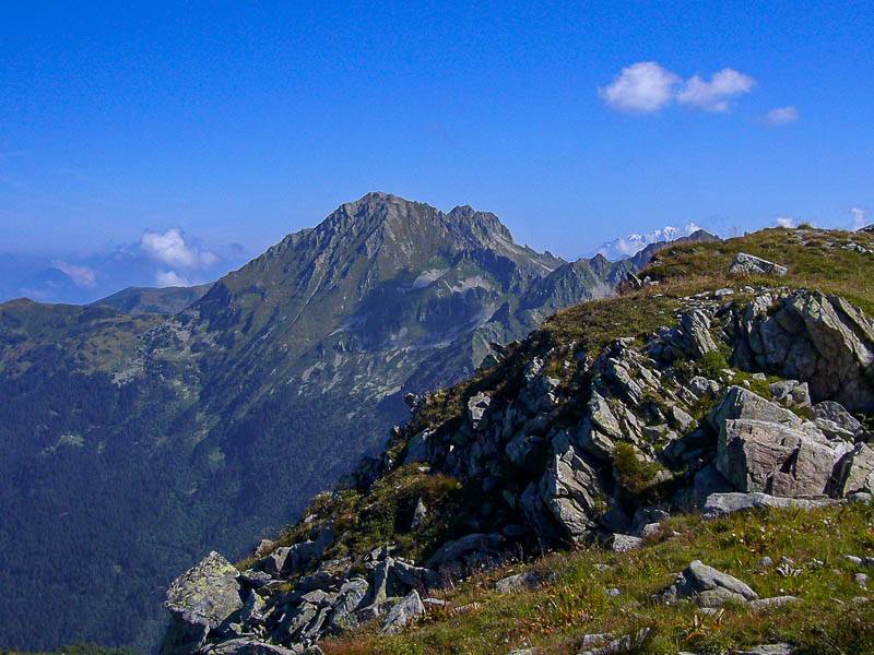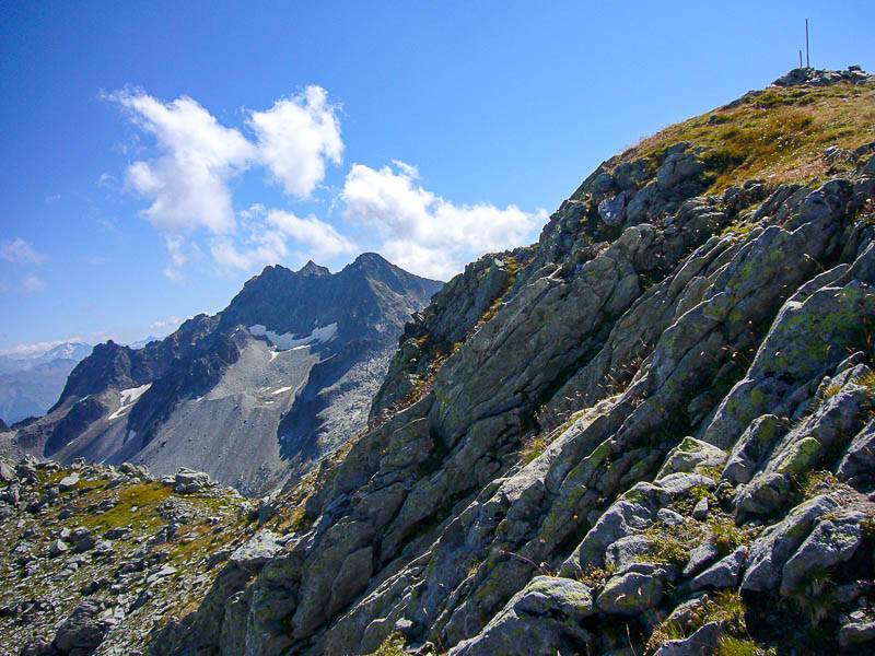 Sortie du ressaut [ 32T 0277932 5027663 ], c'est par un sentier bien tracé que se poursuit l'ascension dans des pentes soutenues qui paraissent faciles. Deux chamois qui s'échappent d'un couloir disparaissent de l'autre côté d'une crête, réapparaissent sur une autre avant de disparaître définitivement. Bientôt sous le sommet, un pointement rocheux de l'arête Est constitue un premier plan idéal pour photographier les sommets plus lointains.