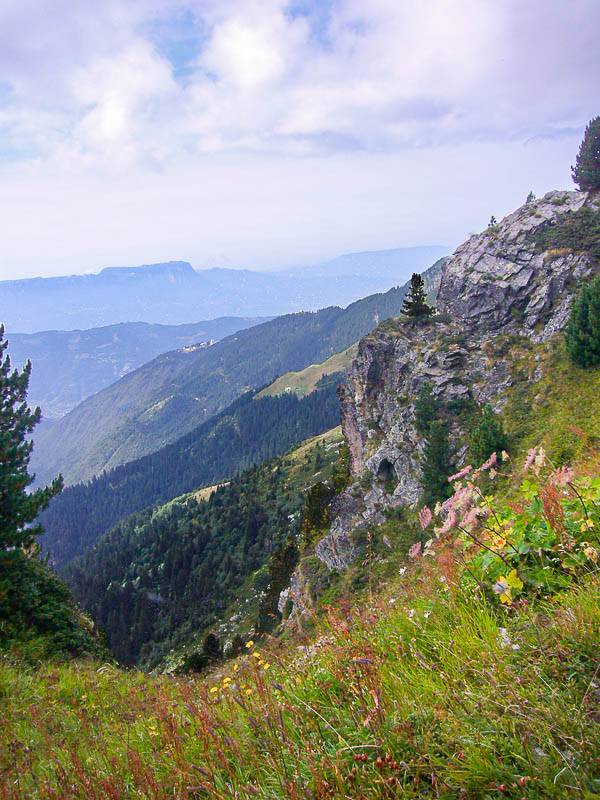 Au loin, La Chartreuse et Chamechaude, depuis le passage avant la sortie du ressaut rocheux (Belledonne Nord, Allevard, Isère – 02/09/08)
