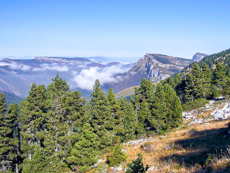 À partir du point [ 31T 0727221 5028097 ], une bonne trace part à gauche rejoindre la crête pour offrir là, une vue saisissante sur la célèbre Tour Percée juste en dessous. La trace se poursuit passant par la lame rocheuse [ UTM 31 0727229 5027807 ] en haut couloir permettant de sortir du sangle de l'Aulp du Seuil. Une courte montée permet d'atteindre la cime des rochers de l'Aulp du Seuil 1926m, une antenne radio est érigée sur le sommet qui offre un vaste panorama. Une mer de nuages couvre le Grésivaudan de laquelle émergent le massif de Belledonne, au Nord les Bauges et plus loin le Mont Blanc, au Sud le Mont Aiguille est facilement identifiable. Être là au soleil, invite à la paresse – je sors le repas du sac à dos.