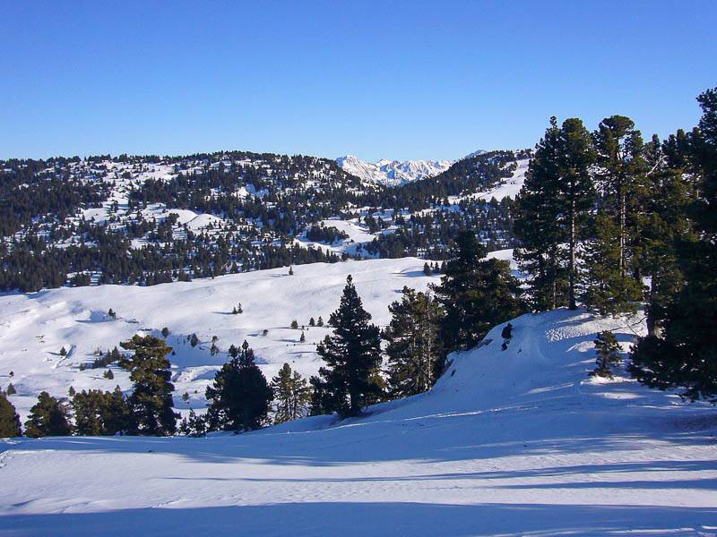À partir du point repéré sur la carte [ 31T 0728507 5034712 ], une trace monte vers l'Ouest, l'itinéraire a donc été suivi récemment. Vers 1700m, la pente s'accentue et j'avais imaginé de passer plus au Sud pour éviter les petites barres rocheuses mentionnées sur la 1/25000e. Mais l'apparente sécurité de la trace m'engage à la suivre. La pente s'accentue encore sur quelques mètres pour franchir un court mur caché sous la neige. Les marches de la trace qui s'effondrent sous mon poids, obligent à une grande enjambée pour prendre pied sur un terrain plus sûr. La montée se poursuit vers la crête, la qualité de la neige est variée, croûtée sur les bosses, profonde dans les creux, portante ou sans cohésion, soufflée et durcie par le gel sur la crête.