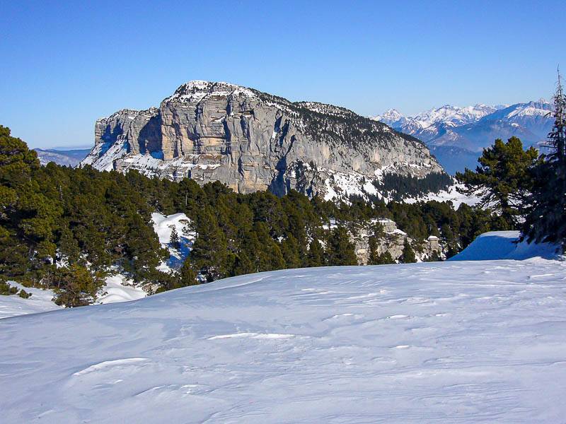 Sur la trace vers le Habert de l'Alpette, l'imposant pilier Sud du Granier s'impose à travers les clairières (Chartreuse orientale, Chapareillan, Isère - 27/12/08)