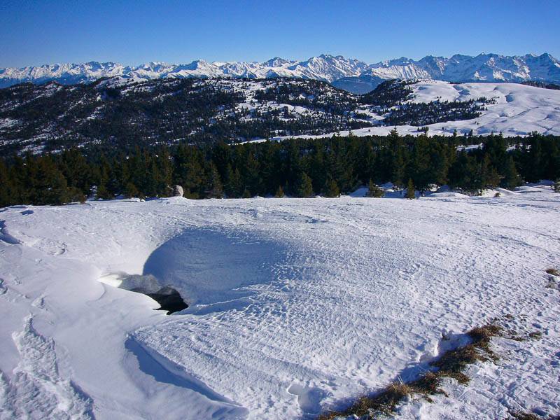 La neige n'a pas entièrement couvert l'entrée du dangereux scialet de l'arête du Sommet du Pinet (Chartreuse orientale, Entremont-le-Vieux, Savoie - 27/12/08)