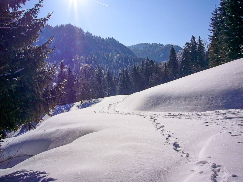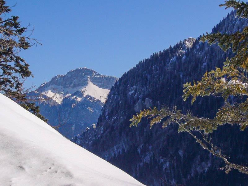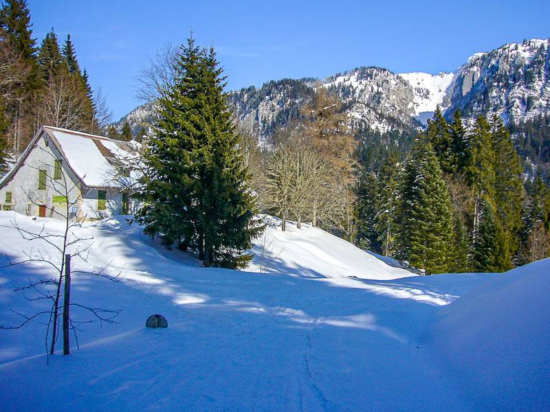 Arrivé au chalet, c'est d'abord en suivant la direction du Col de la Grande Vache que se poursuit la randonnée pour franchir la raide montée du Pas de l'Âne. Ensuite, moins raide, la montée en forêt est plus agréable. Alors que pour contourner une petite dépression, le chemin s'oriente à l'Ouest [ 31T 0714030 5023776 ], j'hésite à suivre la bonne direction vierge d'empreintes… C'est l'originalité aventureuse de la randonnée hivernale.