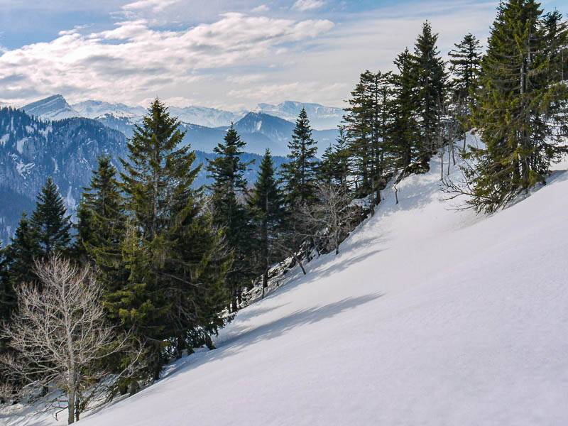 Traversant la Ruchère, on stationnera la voiture plus haut sur le parking du Habert au pied des anciennes pistes de ski alpin [ 31T 0719075 5031260 ]. En revenant sur ses pas, on trouvera à gauche le départ du chemin. Seule la route est déneigée, mais la neige porte bien sur la piste qui monte à flanc jusqu'à l'oratoire Teste de Lavines en suivant l'itinéraire d'été déjà décrit : Petit Som 1772m, depuis La Ruchère. Tranquille la montée se poursuit jusqu'au dessus du Pré Gervet, où commence la piste qui va franchir le Tracol [ 31T 0718815 5029794 ] – je chausse les raquettes. Les chutes de pierres et le grondement sourd d'une avalanche impressionnant dans les soubassements Ouest du Petit Som ont déchiré le silence de la forêt durant la montée vers le Tracol. Sans pouvoir la photographier à travers les branches, j'ai pu observer l'avalanche – impressionnant !