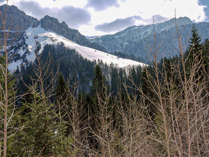 Le collet franchi, le chemin descend tranquillement au Sud Ouest. Après avoir laissé à droite la piste empruntée plusieurs fois au retour du Petit Som, c'est par une traversée agréable en forêt que je débouche dans la prairie de l'Aliénard. Jusqu'au Col, la montée douce permet d'être à l'écoute de la nature encore silencieuse comme en hiver.